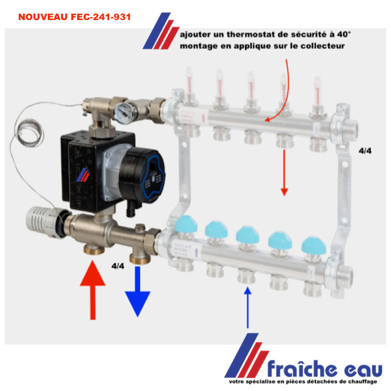 le groupe pompe / vanne thermostatique n'est pas réversible, uniquement collecteur à droite, excepté si l'utilisation du thermomètre intégré n'est pas indispensable , dans le cas de l'utilisation avec le collecteurs à droite il faudra monter un thermomètre en applique