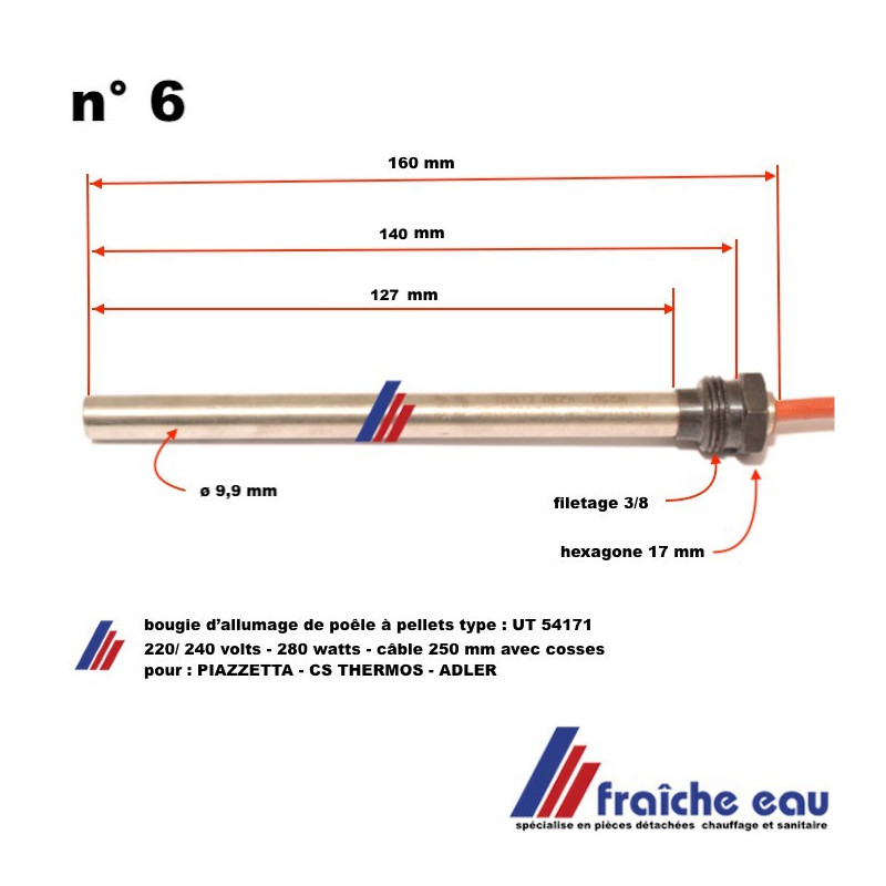 resistance d'allumage PIAZZETTA ø3/8" ø 9,9 x 140 mm 280 w, bougie chauffante CS THERMOS - ADLER